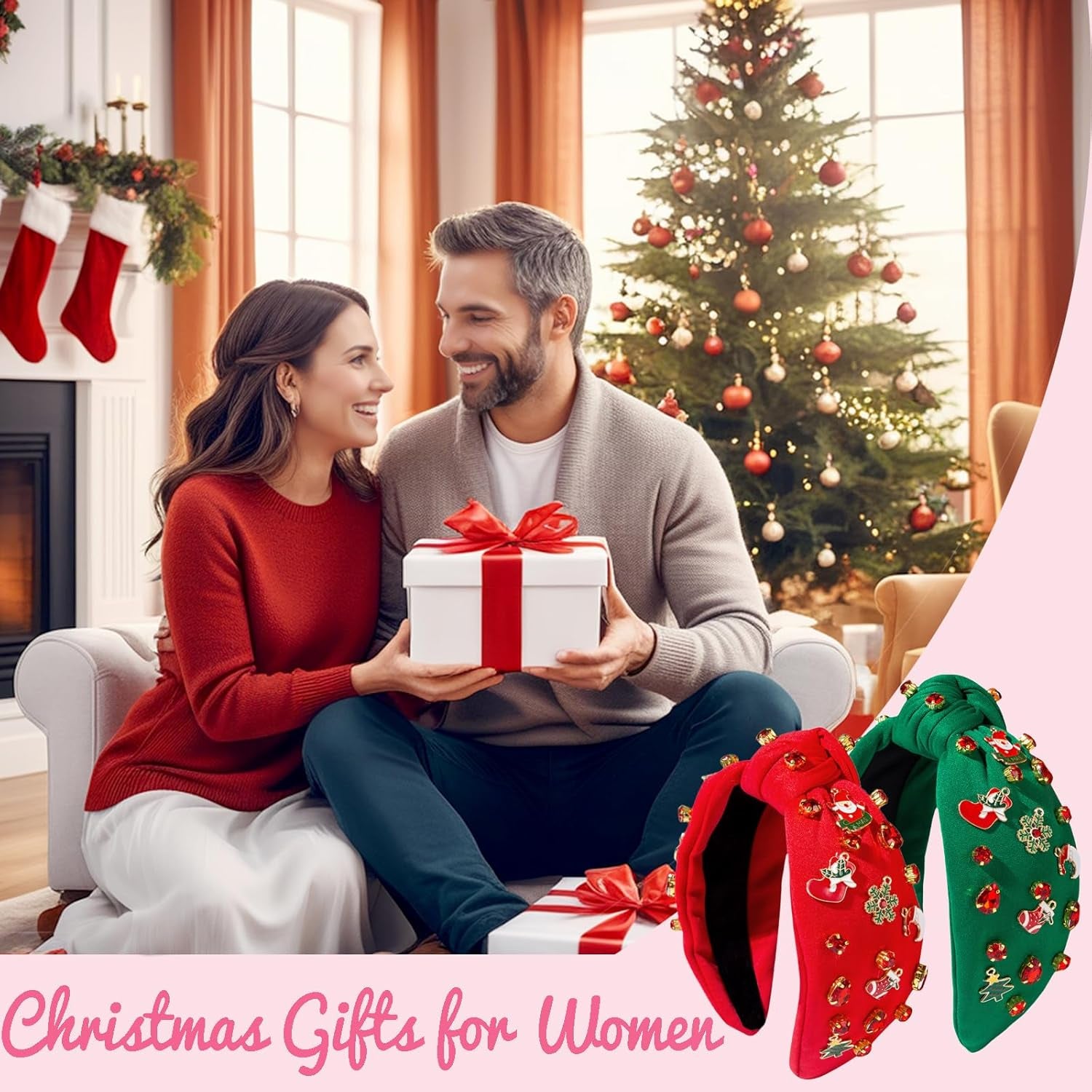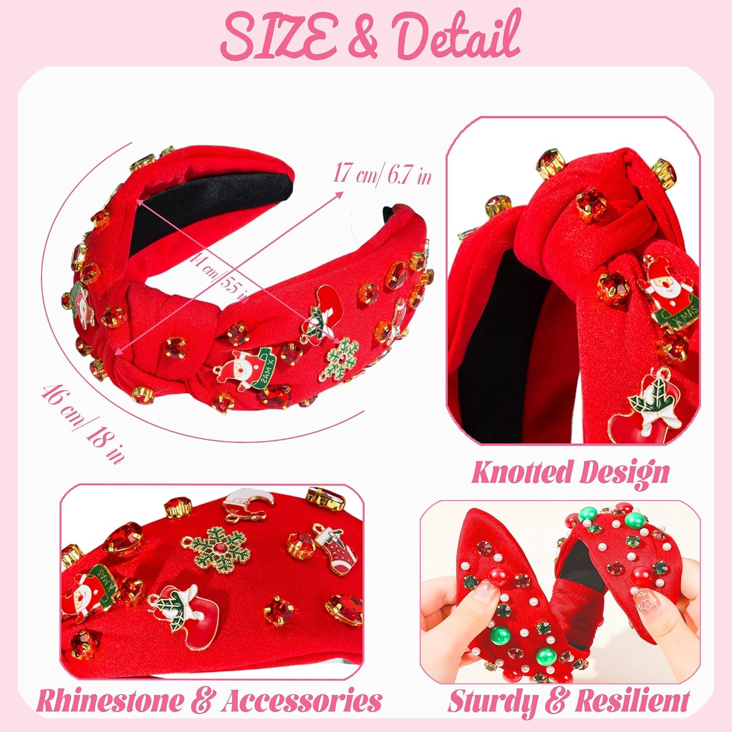 2 Pcs Christmas Knotted Headbands for Women Girls Red Green Pearl Rhinestone Headband with Xmas Tree Santa Accessories Winter Christmas Holiday Gifts for Women