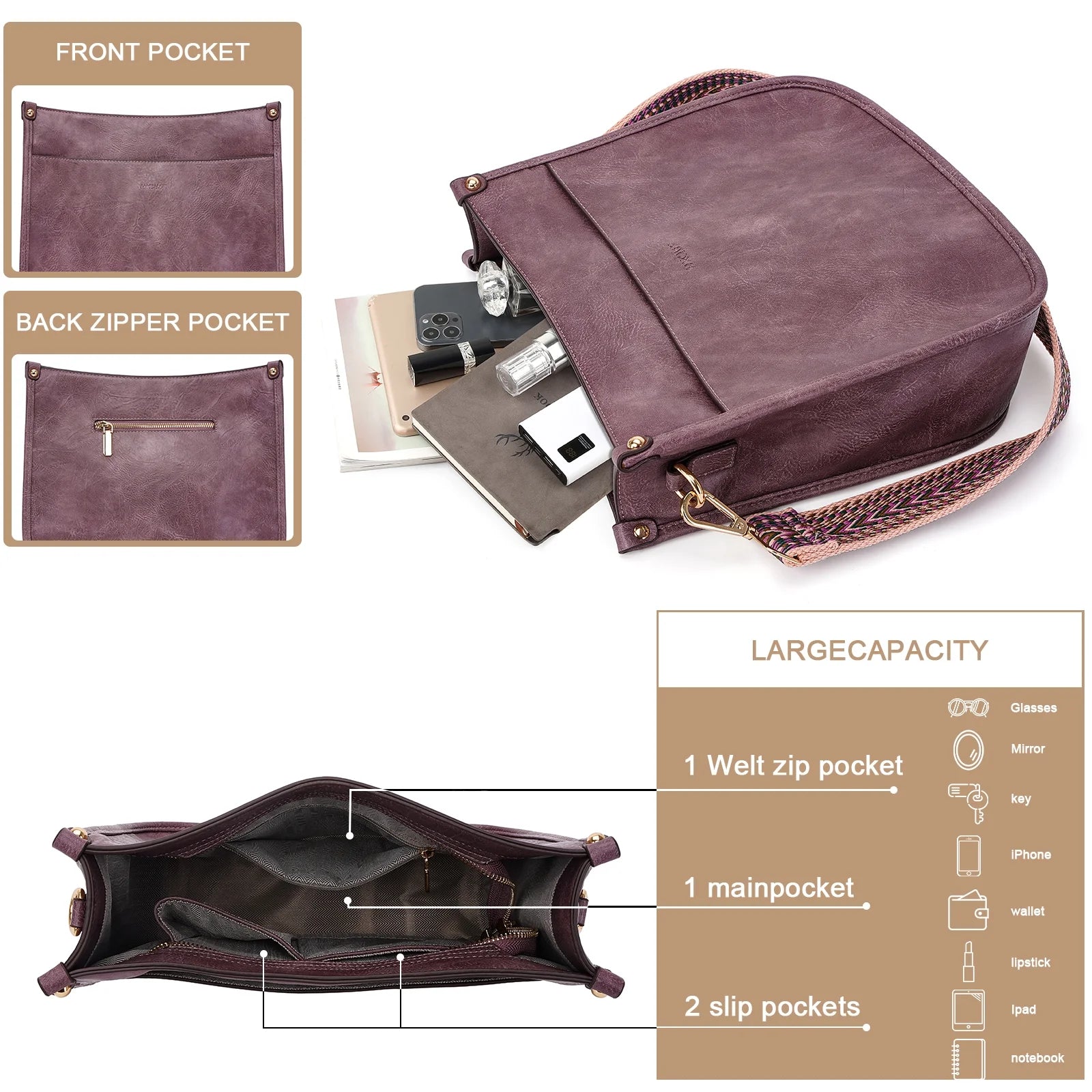 • Perfect Size &Structure: This women crossbody bag dimension:(L)12.28 x (W)3.74inch / (L)10.63inch, the crossbody handbags weight is 0.61 kg / 1.34pounds, Internal structure is one main compartment including 1 main pocket,1 inner zipper pocket,2 slip pockets, one of which is a cell phone pocket and one is a ID card slot. External structure including 1 metal magnetic buckle pocket and 1 side anti-theft pockets, that one in the front and the other in the back.